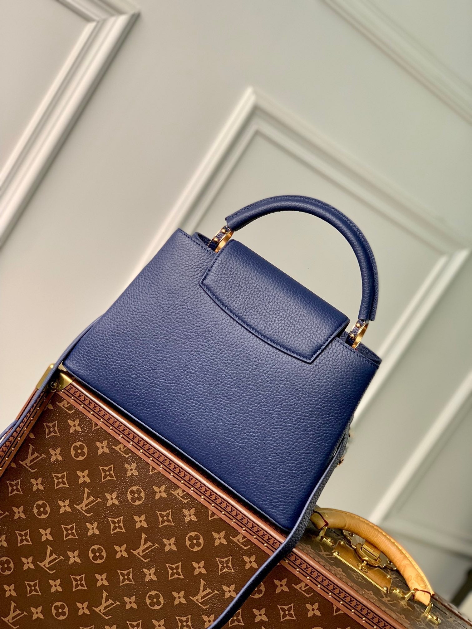capucines mm 31.5 dark blue taurillon leather gold hardware
