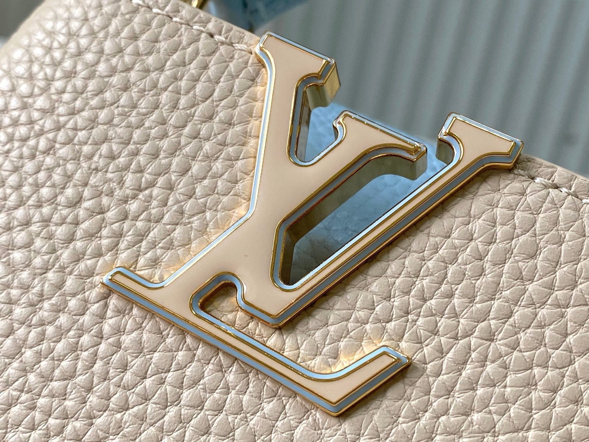 capucines nano 16 beige cloud blue taurrilon leather gold hardware