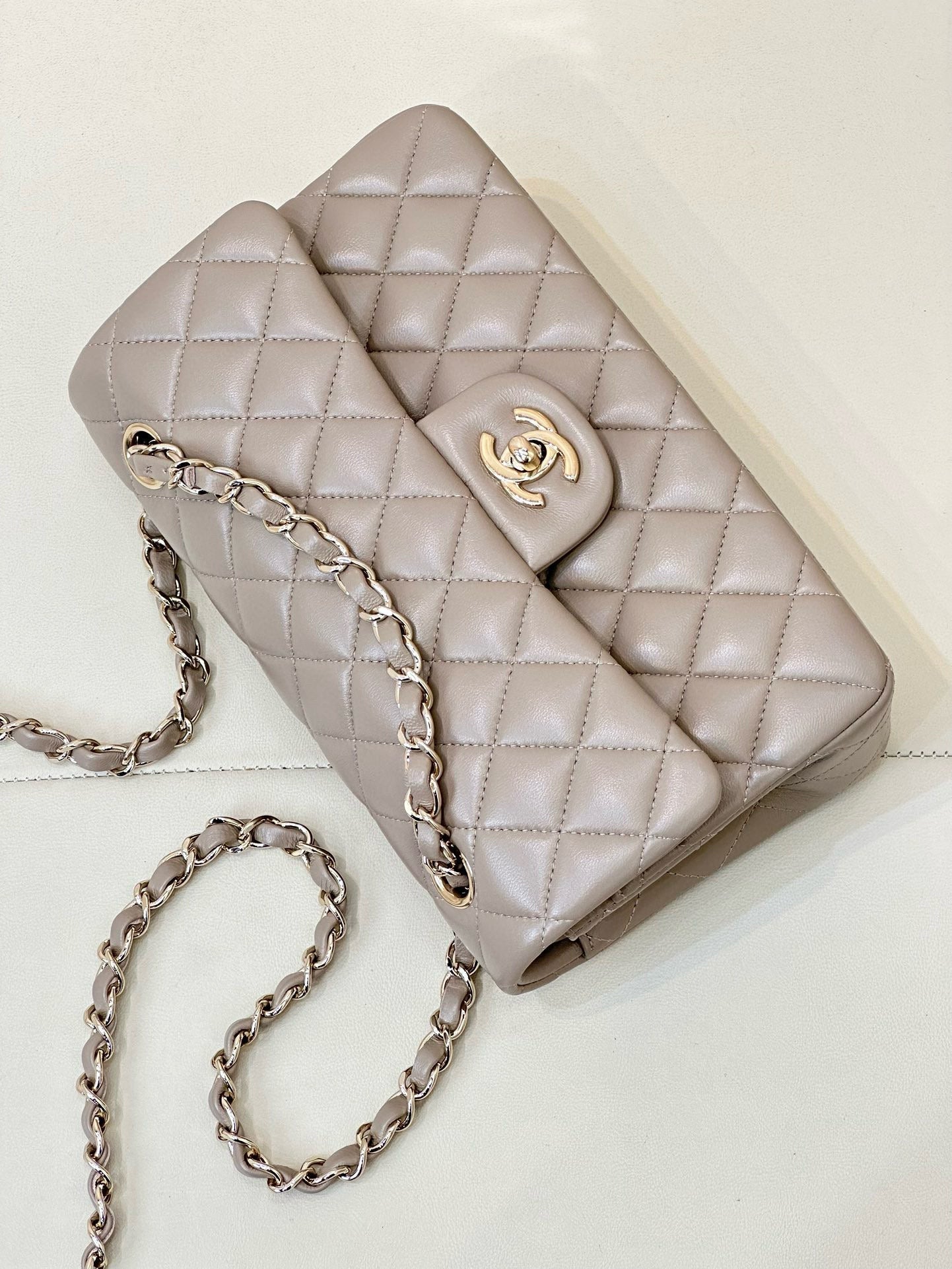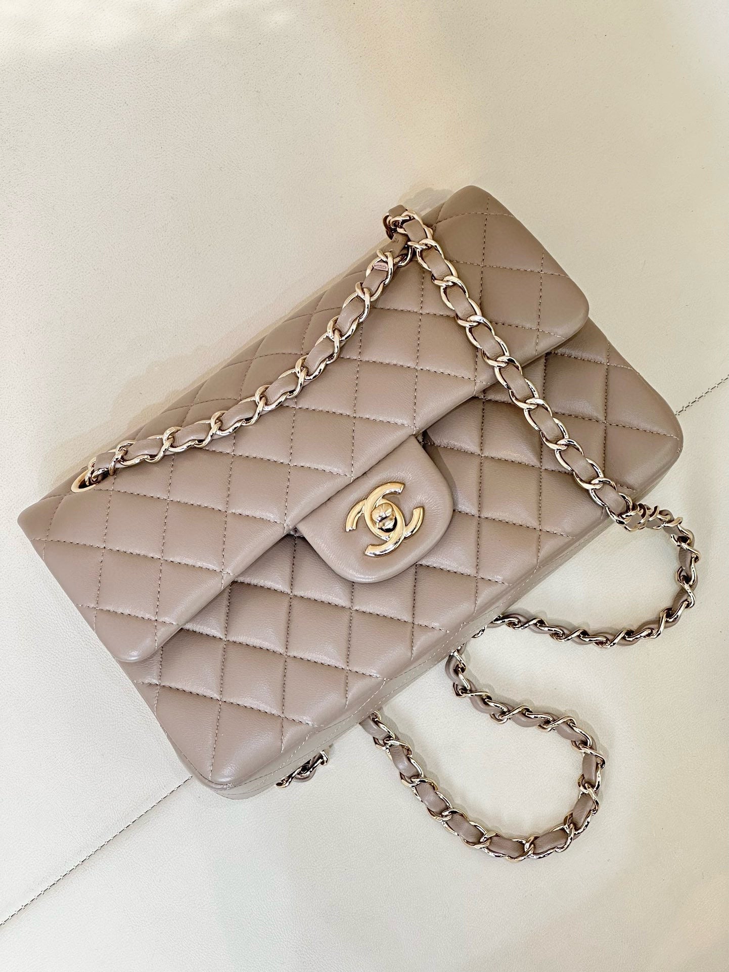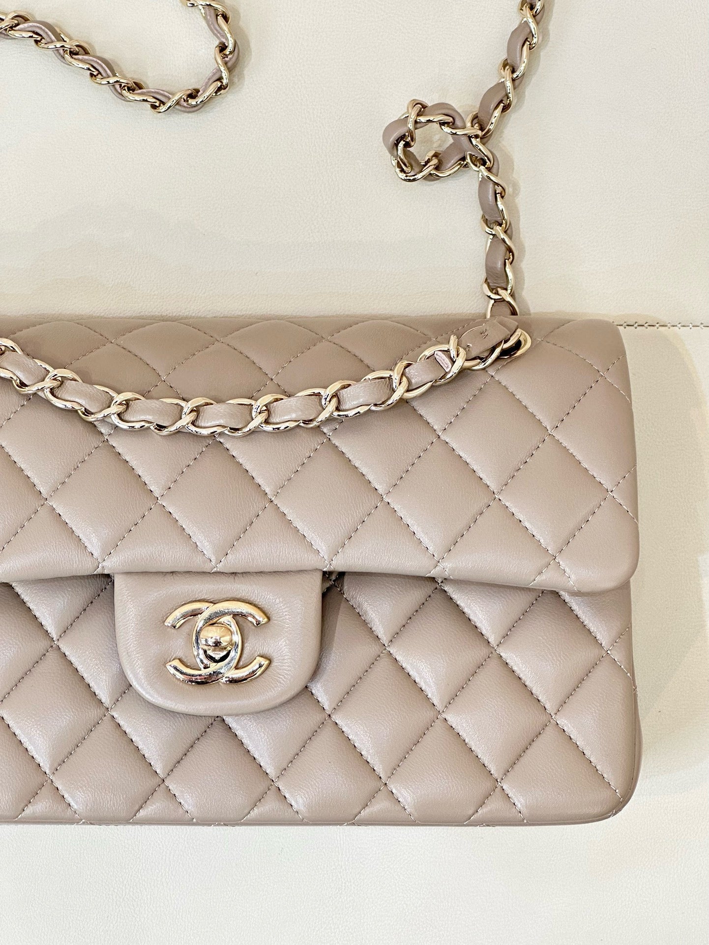 FLAP BAG 23CM BEIGE LAMBSKIN LIGHT GOLD HARDWARE