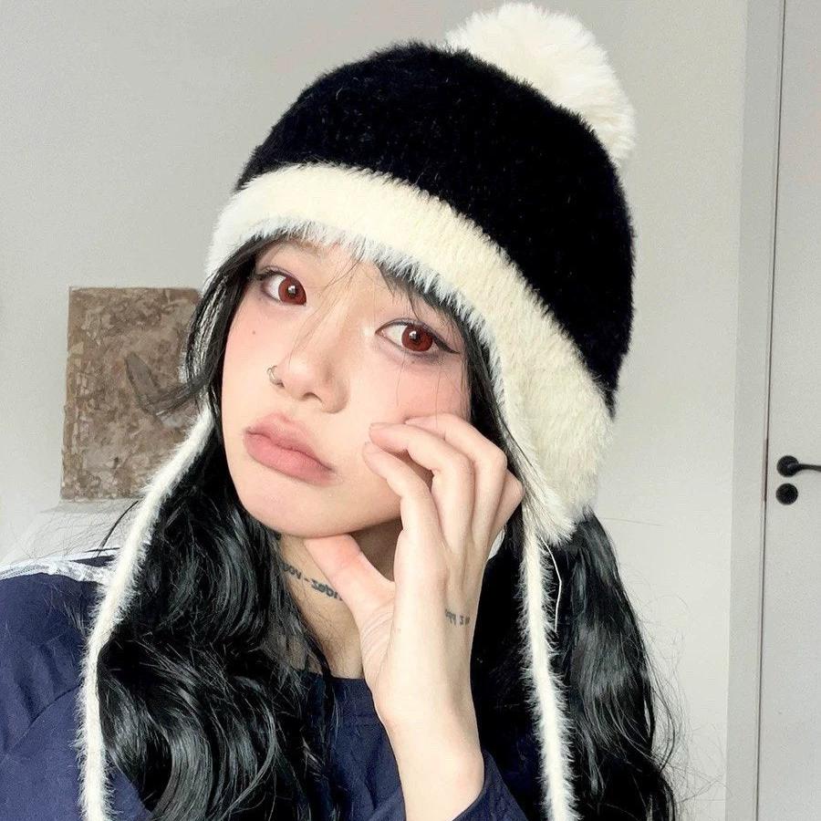 - Sweet girl-style knit hat for women with contrasting colors, ear covers, and a cute pom-pom. Cozy knit design for fall and winter with tie straps, keeping you warm while giving a face-slimming effect.