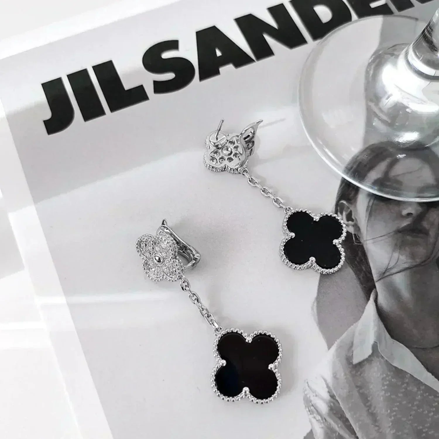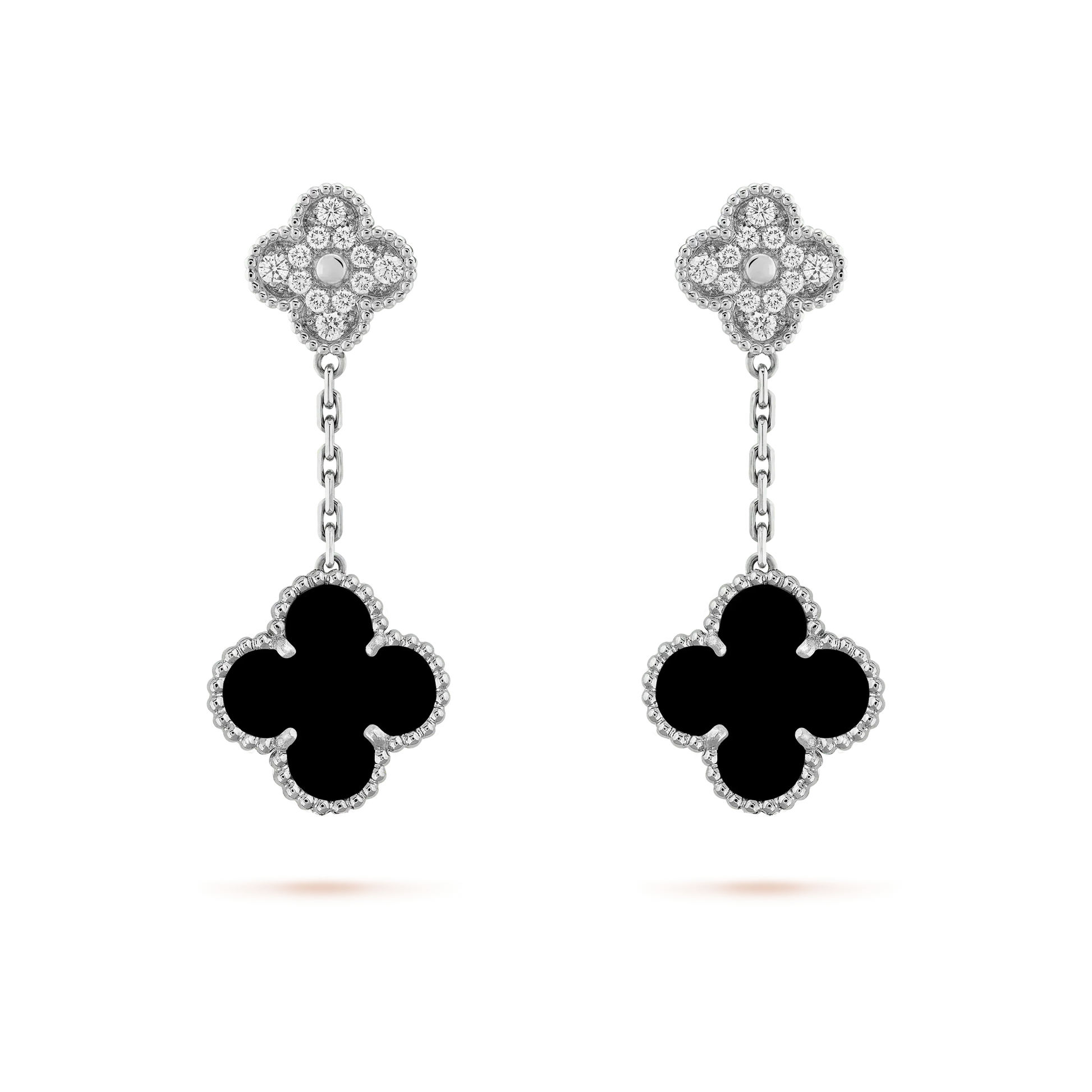 CLOVER 2 MOTIFS DIAMOND ONYX EARRINGS SILVER