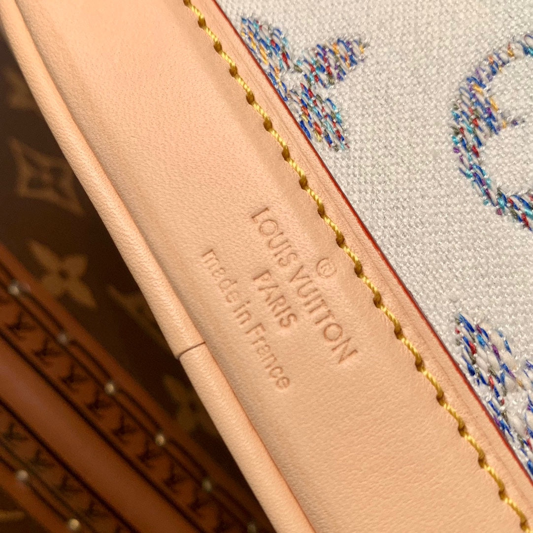 Nano Noe 13x16x10 Beige Leather White Monogram jacquard fabric